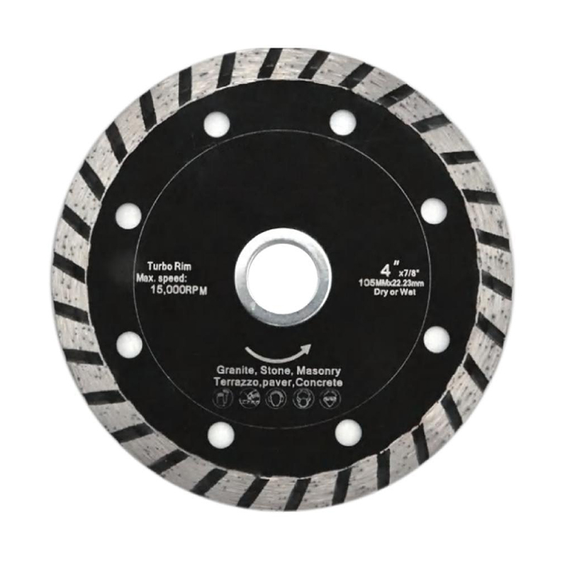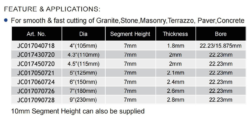 The Cold Pressed Widened Turbo Diamond Blade for General Purpose is engineered for smooth and fast cutting of a wide range of materials including granite, stone, masonry, terrazzo, paver, and concrete. Its widened turbo segment design enhances durability and cutting efficiency. Available in multiple sizes: Art. No. A017040722 for a 4″(105mm) diameter, 7mm segment height, 1.8mm thickness, and 22.23/15.875mm bore; Art. No. A017430722 for a 4.3″(110mm) diameter and 2mm thickness; Art. No. A017450722 for a 4.5″(115mm) diameter and 2mm thickness; Art. No. A017050722 for a 5″(125mm) diameter and 2.1mm thickness; Art. No. A017060722 for a 6″(150mm) diameter and 2.4mm thickness; Art. No. A017070722 for a 7″(180mm) diameter and 2.6mm thickness; and Art. No. A017090722 for a 9″(230mm) diameter and 2.8mm thickness, all with a standard 7mm segment height and primarily a 22.23mm bore, with a 10mm segment height option also available upon request.