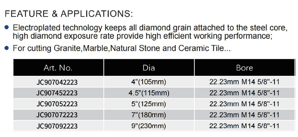 Electroplated Diamond Blade with Protective Teeth for General Purpose utilizes advanced electroplating technology that firmly bonds all diamond grit to the steel core, ensuring a high diamond exposure rate for efficient cutting performance on materials such as granite, marble, natural stone, and ceramic tile. The blade is available in multiple diameters: 4″ (105mm), 4.5″ (115mm), 5″ (125mm), 7″ (180mm), and 9″ (230mm), all featuring a bore size of 22.23mm and compatibility with M14 5/8″-11 arbors.