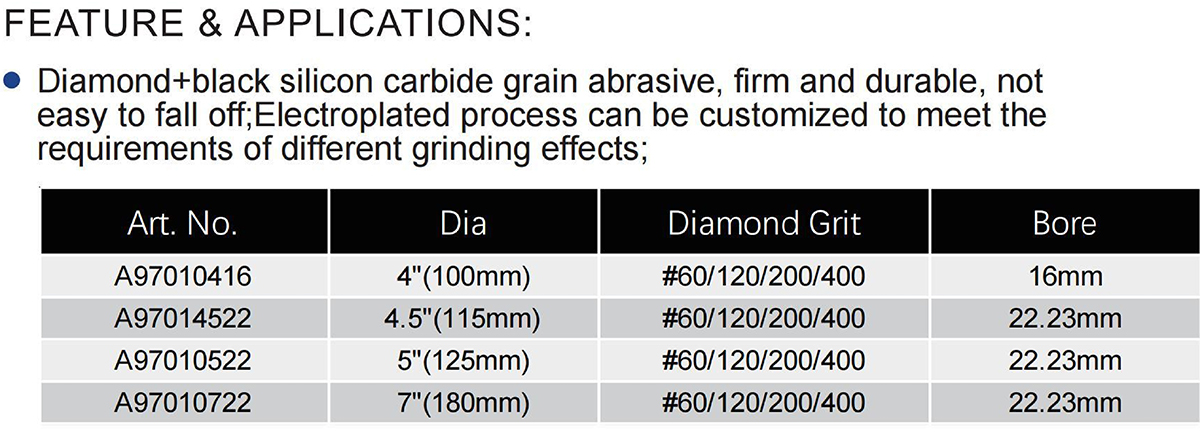 Electroplated Diamond Grinding Plate for General Purpose is crafted with a blend of diamond and black silicon carbide abrasive grains, making it exceptionally firm, durable, and resistant to grain loss; its electroplated process can be customized to achieve different grinding effects. Available in multiple sizes: Art. No. A97010416 is 4″ (100 mm) in diameter with a 16 mm bore; Art. No. A97014522 is 4.5″ (115 mm) in diameter with a 22.23 mm bore; Art. No. A97010522 is 5″ (125 mm) in diameter with a 22.23 mm bore; and Art. No. A97010722 is 7″ (180 mm) in diameter with a 22.23 mm bore. All models are offered with diamond grit options of #60, #120, #200, and #400.