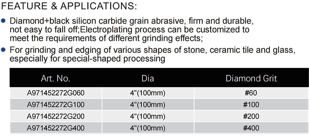 The Electroplated Diamond Silicon Carbide Grinding Plate with an arrow pattern is designed for general-purpose grinding and edging of various materials, including stone, ceramic tile, and glass, especially for specialized and shaped processing. It combines diamond and black silicon carbide grains for a firm, durable abrasive surface that is wear-resistant, and its electroplating process allows for customization to achieve different grinding effects. This 4-inch (100 mm) diameter grinding plate is available in four grit options: #60 (Art. No. A971452272G060), #100 (Art. No. A971452272G100), #200 (Art. No. A971452272G200), and #400 (Art. No. A971452272G400), providing versatility for a range of material removal and finishing tasks.