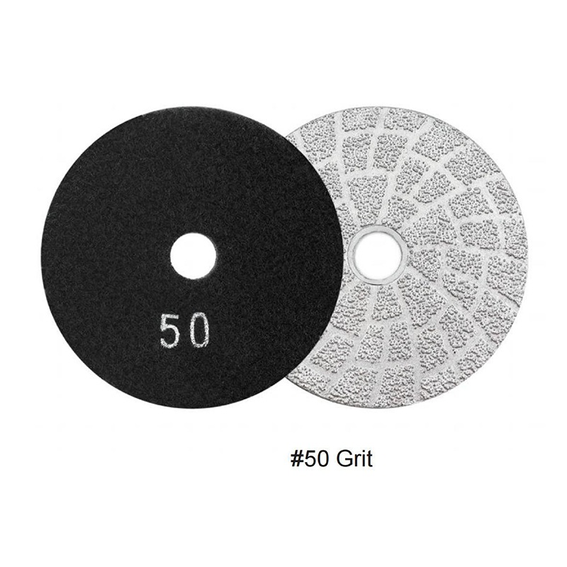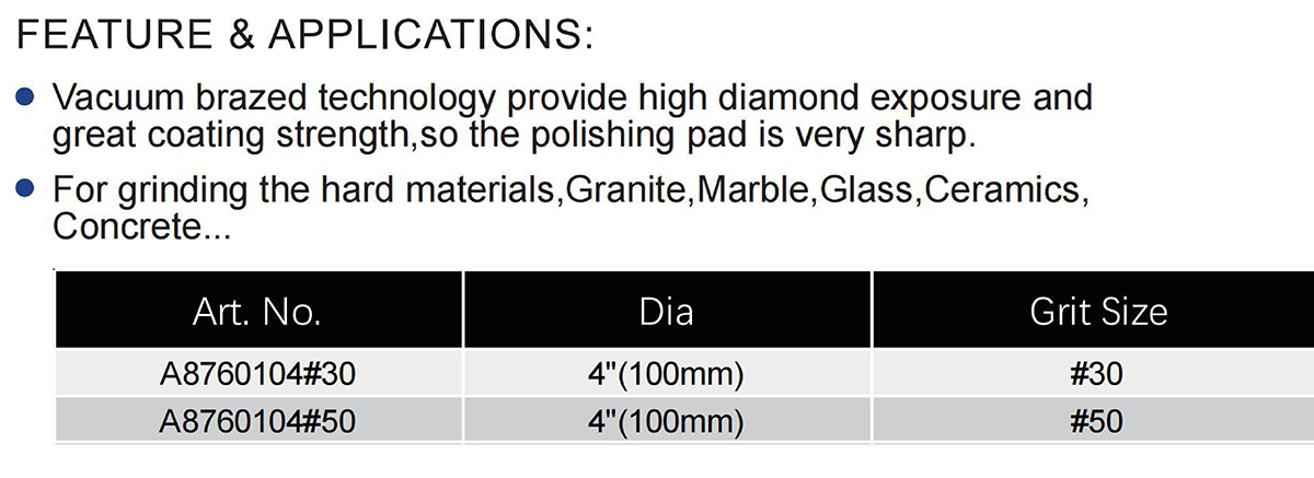 Vacuum Brazed Diamond Grinding Plate for general purpose utilizes vacuum brazed technology to provide high diamond exposure and great coating strength, resulting in a very sharp polishing pad ideal for grinding hard materials such as granite, marble, glass, ceramics, and concrete. It is available in two specifications: Art. No. A8760104#30 with a 4″ (100 mm) diameter and #30 grit size, and Art. No. A8760104#50 with a 4″ (100 mm) diameter and #50 grit size.