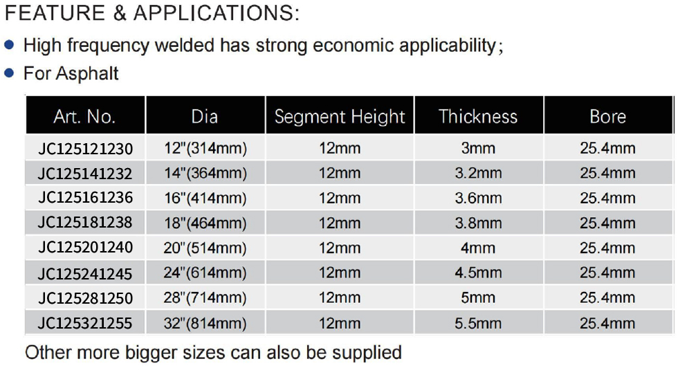 High Frequency Welded Diamond Blade with BigU-slot is engineered for asphalt cutting, offering strong economic applicability and efficient performance. It is available in multiple sizes: Art. No. A125121225 at 12″ (314mm) diameter with 3mm thickness; A125141225 at 14″ (364mm) with 3.2mm thickness; A125161225 at 16″ (414mm) with 3.6mm thickness; A125181225 at 18″ (464mm) with 3.8mm thickness; A125201225 at 20″ (514mm) with 4mm thickness; A125241225 at 24″ (614mm) with 4.5mm thickness; A125281225 at 28″ (714mm) with 5mm thickness; and A125321225 at 32″ (814mm) with 5.5mm thickness. All blades feature a consistent segment height of 12mm and a bore size of 25.4mm, with other larger sizes also available upon request.