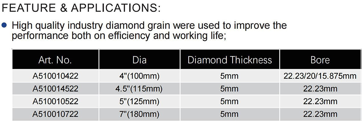 The High Frequency Welded Double Row Diamond Grinding Cup Wheel for General Purpose utilizes high-quality industrial diamond grains to deliver superior performance in efficiency and working life. Its double-row segment design is ideal for aggressive grinding and smoothing surfaces on a variety of materials including concrete, stone, and masonry. This wheel is available in multiple sizes: Art. No. A510010422 with a 4″ (100mm) diameter and a versatile bore of 22.23/20/15.875mm; Art. No. A510014522 with a 4.5″ (115mm) diameter and a 22.23mm bore; Art. No. A510010522 with a 5″ (125mm) diameter and a 22.23mm bore; and Art. No. A510010722 with a 7″ (180mm) diameter and a 22.23mm bore, all featuring a consistent diamond thickness of 5mm.