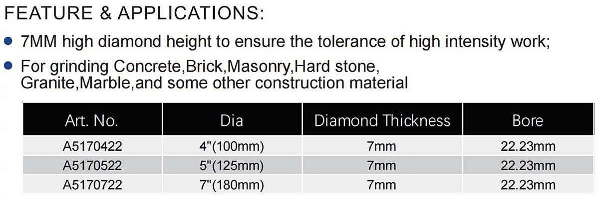 The High Frequency Welded Hollow Cylindrical Diamond Grinding Cup Wheel for General Purpose is designed for high-intensity grinding on concrete, brick, masonry, hard stone, granite, and marble. It features a 7mm high diamond segment to ensure excellent tolerance and durability. Available in three sizes: Art. No. A5170422 with a 4″ (100mm) diameter, Art. No. A5170522 with a 5″ (125mm) diameter, and Art. No. A5170722 with a 7″ (180mm) diameter, all featuring a 7mm diamond thickness and a 22.23mm bore.