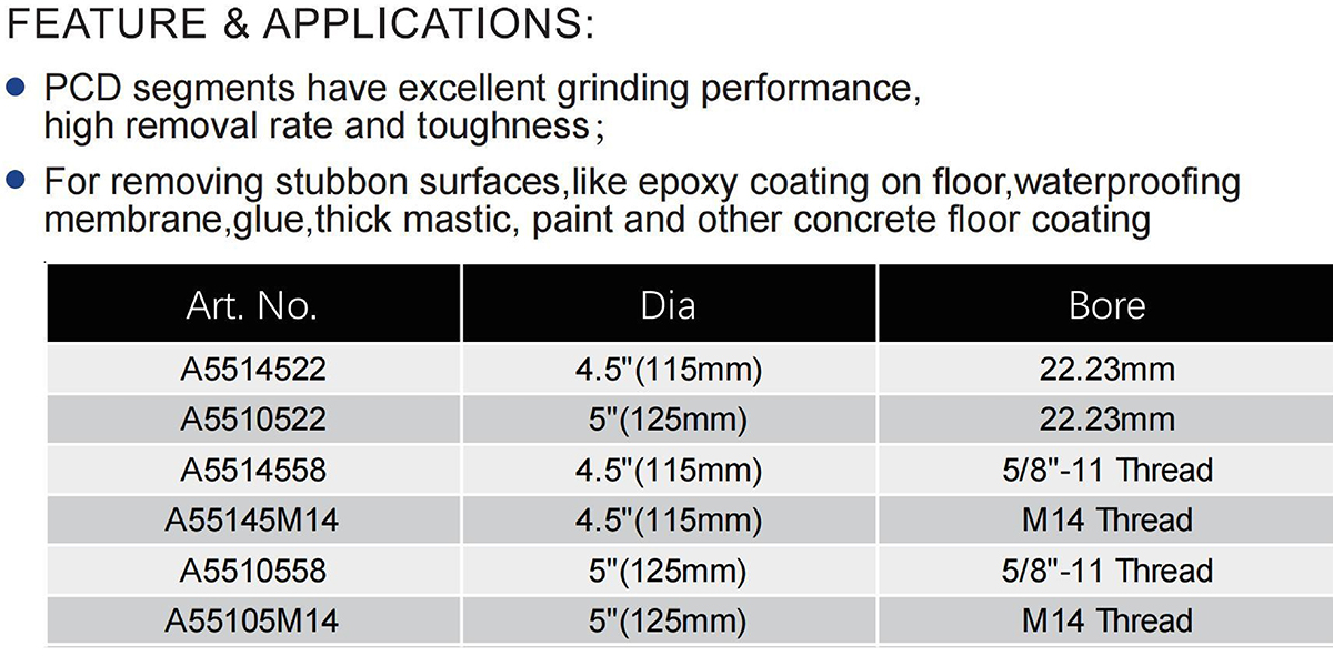 The High Frequency Welded PCD Grinding Cup Wheel is engineered with PCD segments that deliver excellent grinding performance, a high removal rate, and superior toughness for tackling stubborn surfaces such as epoxy coatings, waterproofing membranes, glue, thick mastic, paint, and other concrete floor coatings. It is available in the following specifications: Art. No. A5514522 (4.5″/115mm diameter, 22.23mm bore), A5510522 (5″/125mm diameter, 22.23mm bore), A5514558 (4.5″/115mm diameter, 5/8″-11 thread), A55145M14 (4.5″/115mm diameter, M14 thread), A5510558 (5″/125mm diameter, 5/8″-11 thread), and A55105M14 (5″/125mm diameter, M14 thread).