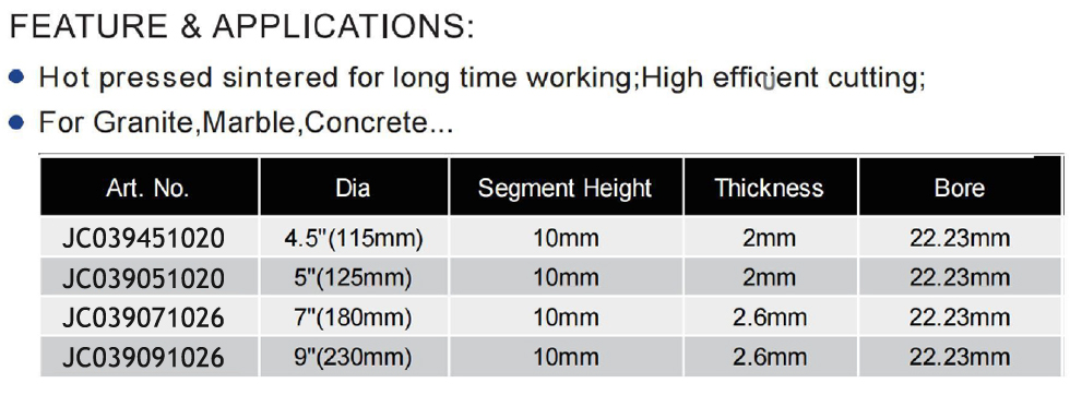 The Hot Pressed Segmented Turbo Diamond Blade for General Purpose is engineered with hot-pressing technology for exceptional durability and efficient cutting on a wide range of materials including granite, marble, concrete, porcelain tile, ceramic tile, masonry, and stone. Its segmented turbo rim is designed for aggressive cutting and efficient debris removal, allowing for both wet and dry use with minimal dust and vibration. It is available in multiple sizes: Art. No. A039451022 at 4.5″ (115mm) diameter, 10mm segment height, 2mm thickness; Art. No. A039051022 at 5″ (125mm) diameter, 10mm segment height, 2mm thickness; Art. No. A039071022 at 7″ (180mm) diameter, 10mm segment height, 2.6mm thickness; and Art. No. A039091022 at 9″ (230mm) diameter, 10mm segment height, 2.6mm thickness, with all models featuring a standard 22.23mm bore. Ideal for use with angle grinders, this versatile blade is a robust solution for professional and DIY cutting tasks.