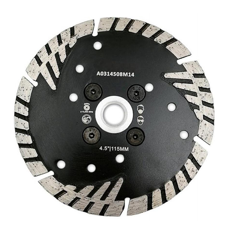 Hot Pressed Turbo Diamond Blade with Protective Teeth for General Purpose utilizes hot-pressing technology for efficient and durable cutting on a wide range of materials including stone, concrete, brick tile, granite, and marble. Its turbo rim with triangle protection teeth is designed for smooth and deep cutting. Available in multiple sizes: Art. No. A0310408 for 4″(105mm) diameter with 8mm segment height, 2mm thickness, and 22.23mm bore; Art. No. A0314508 for 4.5″(115mm) diameter; Art. No. A0310508 for 5″(125mm) diameter with 2.2mm thickness; Art. No. A0310608 for 6″(150mm) diameter; Art. No. A0310708 for 7″(180mm) diameter with 2.4mm thickness; Art. No. A0310808 for 8″(200mm) diameter with 2.6mm thickness; Art. No. A0310908 for 9″(230mm) diameter; Art. No. A0311008 for 10″(250mm) diameter with 2.8mm thickness and 25.4/20mm bore; Art. No. A0311210 for 12″(300mm) diameter with 10mm segment height and 3.2mm thickness; and Art. No. A0311410 for 14″(350mm) diameter.