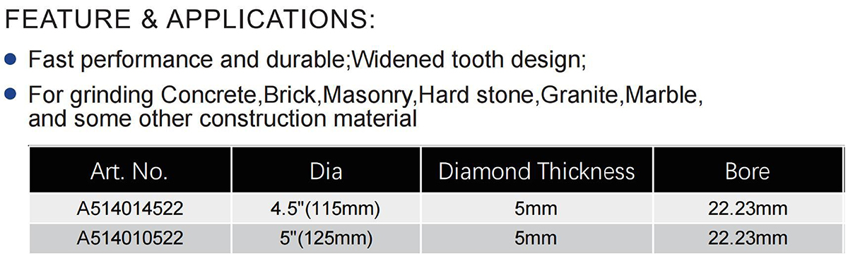 The Hot Pressed Turbo Single Row Diamond Grinding Cup Wheel is designed for general-purpose grinding tasks on materials such as concrete, brick, masonry, hard stone, granite, and marble. It features a robust single-row segment layout with a widened tooth design, ensuring fast performance and enhanced durability. Available in two sizes: Art. No. A514014522 with a 4.5″ (115 mm) diameter and Art. No. A514010522 with a 5″ (125 mm) diameter, both featuring a 5 mm diamond thickness and a standard 22.23 mm bore, making it an ideal tool for angle grinders to simplify construction and renovation work.