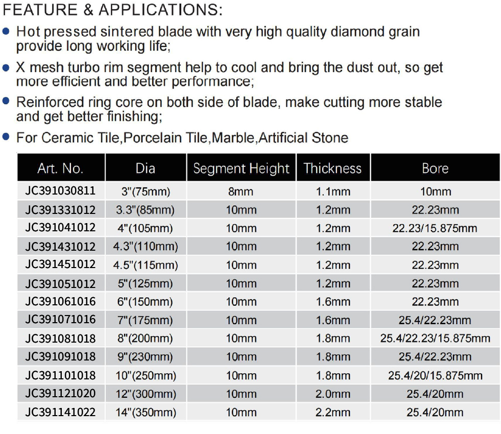 The Hot Pressed X-Mesh Diamond Blade with Reinforced Ring Core is designed for long-lasting, efficient cutting of ceramic, porcelain, marble, and artificial stone. It utilizes hot-pressing technology with high-quality diamond grains for an extended working life. The X-Mesh turbo rim segment aids in cooling and dust extraction for better performance, while the reinforced ring core on both sides ensures stable, smooth cutting and a superior finish. Available sizes with complete specifications are: Art. No. A391031210 for 3″(75mm) diameter, 8mm segment height, 1.1mm thickness, 10mm bore; Art. No. A391331222 for 3.3″(85mm), 10mm segment height, 1.2mm thickness, 22.23mm bore; Art. No. A391041222R for 4″(105mm), 10mm segment height, 1.2mm thickness, 22.23/15.875mm bore; Art. No. A391431222R for 4.3″(110mm), 10mm segment height, 1.2mm thickness, 22.23mm bore; Art. No. A391451222R for 4.5″(115mm), 10mm segment height, 1.2mm thickness, 22.23mm bore; Art. No. A391051222R for 5″(125mm), 10mm segment height, 1.2mm thickness, 22.23mm bore; Art. No. A391061622R for 6″(150mm), 10mm segment height, 1.6mm thickness, 22.23mm bore; Art. No. A391071625R for 7″(175mm), 10mm segment height, 1.6mm thickness, 25.4/22.23mm bore; Art. No. A391081825R for 8″(200mm), 10mm segment height, 1.8mm thickness, 25.4/22.23/15.875mm bore; Art. No. A391091825R for 9″(230mm), 10mm segment height, 1.8mm thickness, 25.4/22.23mm bore; Art. No. A391101825R for 10″(250mm), 10mm segment height, 1.8mm thickness, 25.4/20/15.875mm bore; Art. No. A391122025R for 12″(300mm), 10mm segment height, 2.0mm thickness, 25.4/20mm bore; Art. No. A391142225R for 14″(350mm), 10mm segment height, 2.2mm thickness, 25.4/20mm bore. Suitable for both wet and dry use with angle grinders and circular saws.