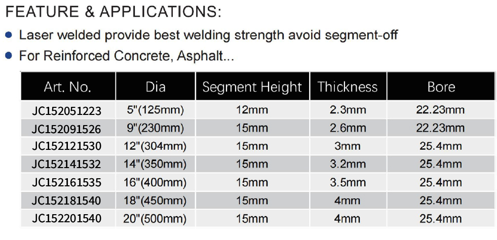 The Laser Welded Arrow Turbo Diamond Blade is engineered with advanced laser-welded technology to provide the highest welding strength, effectively preventing segment detachment, and is specifically designed for demanding cutting applications on reinforced concrete and asphalt. It is available in multiple sizes including: Art. No. A1520512 at 5″ (125mm) diameter, 12mm segment height, 2.3mm thickness, and a 22.23mm bore; Art. No. A1520915 at 9″ (230mm) diameter, 15mm segment height, 2.6mm thickness, and a 22.23mm bore; Art. No. A1521215 at 12″ (304mm) diameter, 15mm segment height, 3mm thickness, and a 25.4mm bore; Art. No. A1521415 at 14″ (350mm) diameter, 15mm segment height, 3.2mm thickness, and a 25.4mm bore; Art. No. A1521615 at 16″ (400mm) diameter, 15mm segment height, 3.5mm thickness, and a 25.4mm bore; Art. No. A1521815 at 18″ (450mm) diameter, 15mm segment height, 4mm thickness, and a 25.4mm bore; and Art. No. A1522015 at 20″ (500mm) diameter, 15mm segment height, 4mm thickness, and a 25.4mm bore.