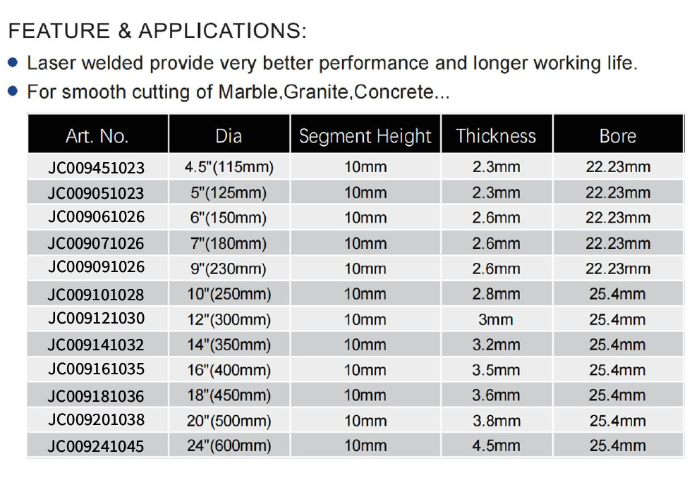 Laser Welded Diamond Blade for General Purpose delivers efficient and long-lasting cutting performance, specifically designed for smooth cutting of materials like marble, granite, and concrete. The advanced laser welding technology ensures a stronger bond for enhanced durability and a longer working life. It is available in a comprehensive range of sizes to suit various needs: Art. No. A009451022 at 4.5″ (115mm) with a thickness of 2.3mm and a 22.23mm bore; Art. No. A009051022 at 5″ (125mm), 2.3mm thickness, 22.23mm bore; Art. No. A009061022 at 6″ (150mm), 2.6mm thickness, 22.23mm bore; Art. No. A009071022 at 7″ (180mm), 2.6mm thickness, 22.23mm bore; Art. No. A009091022 at 9″ (230mm), 2.6mm thickness, 22.23mm bore; Art. No. A009101022 at 10″ (250mm), 2.8mm thickness, 25.4mm bore; Art. No. A009121025 at 12″ (300mm), 3.0mm thickness, 25.4mm bore; Art. No. A009141025 at 14″ (350mm), 3.2mm thickness, 25.4mm bore; Art. No. A009161025 at 16″ (400mm), 3.5mm thickness, 25.4mm bore; Art. No. A009181025 at 18″ (450mm), 3.6mm thickness, 25.4mm bore; Art. No. A009201025 at 20″ (500mm), 3.8mm thickness, 25.4mm bore; and Art. No. A009241025 at 24″ (600mm) with a thickness of 4.5mm and a 25.4mm bore. All blades feature a consistent segment height of 10mm.