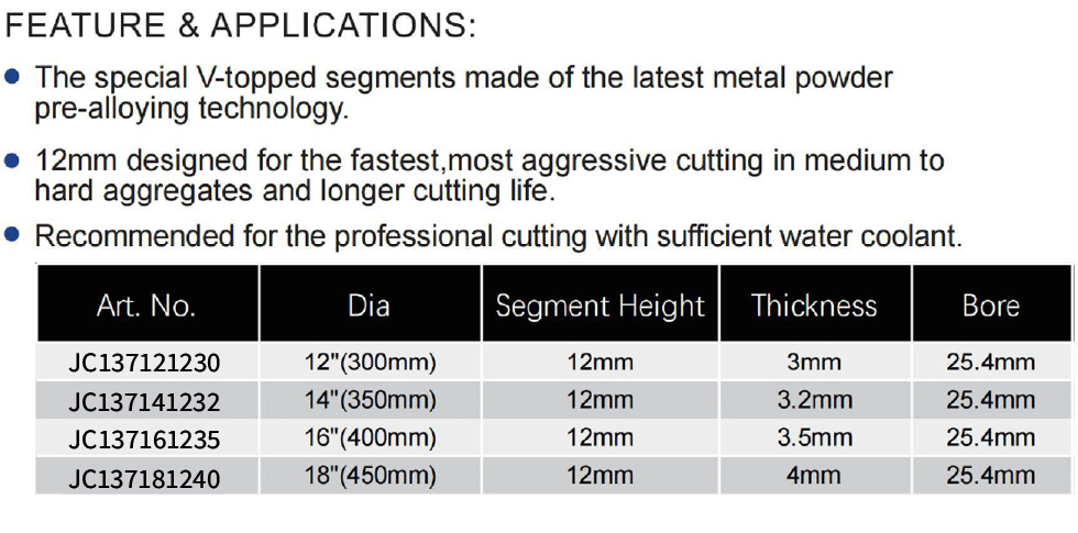 The Laser Welded Diamond Blade with W-Shape Segment is engineered for aggressive cutting of reinforced concrete. It features special V-topped segments made with advanced metal powder pre-alloying technology, and the 12mm segment height is designed for the fastest cutting in medium to hard aggregates while providing a longer service life. Professional use with sufficient water coolant is recommended for optimal results on angle grinders or circular saws. It is available in the following sizes: Art. No. A137121225 at 12″ (300mm) diameter, 12mm segment height, 3.0mm thickness, and 25.4mm bore; Art. No. A137141225 at 14″ (350mm) diameter, 12mm segment height, 3.2mm thickness, and 25.4mm bore; Art. No. A137161225 at 16″ (400mm) diameter, 12mm segment height, 3.5mm thickness, and 25.4mm bore; Art. No. A137181225 at 18″ (450mm) diameter, 12mm segment height, 4.0mm thickness, and 25.4mm bore.