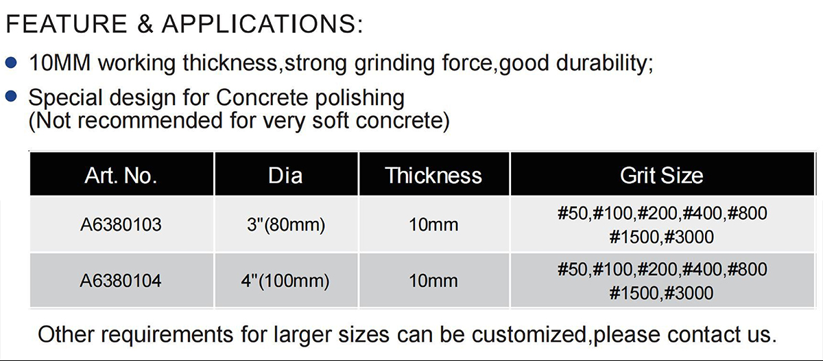 Resin Bond Diamond Dry & Wet Polishing Pads are engineered for concrete surfaces, featuring a 10 mm working thickness for strong grinding force and durability. Designed specifically for efficient concrete polishing, they are available in two diameters—3″ (80 mm) and 4″ (100 mm)—and cover a complete grit range including #50, #100, #200, #400, #800, #1500, and #3000 for progressive grinding and high-gloss finishing.