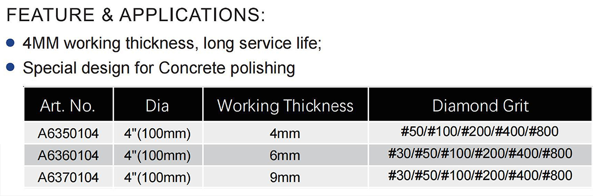 Resin Bond Diamond Dry & Wet Polishing Pads for Stone (Thickened) are specially designed for concrete and stone polishing, offering a long service life and effective results for both dry and wet polishing applications. These pads feature a 4-inch (100mm) diameter and are available in three thickened working thicknesses: 4mm (Art. No. A6350104), 6mm (Art. No. A6360104), and 9mm (Art. No. A6370104). A comprehensive range of diamond grits is offered, including #30, #50, #100, #200, #400, and #800, to provide a complete polishing sequence from coarse grinding to fine finishing.