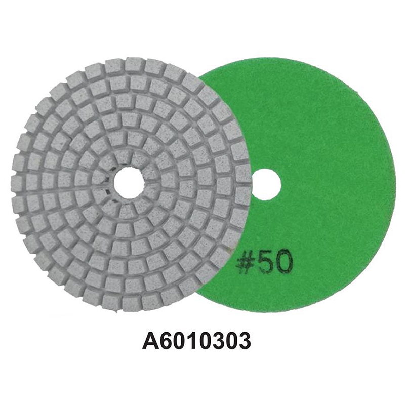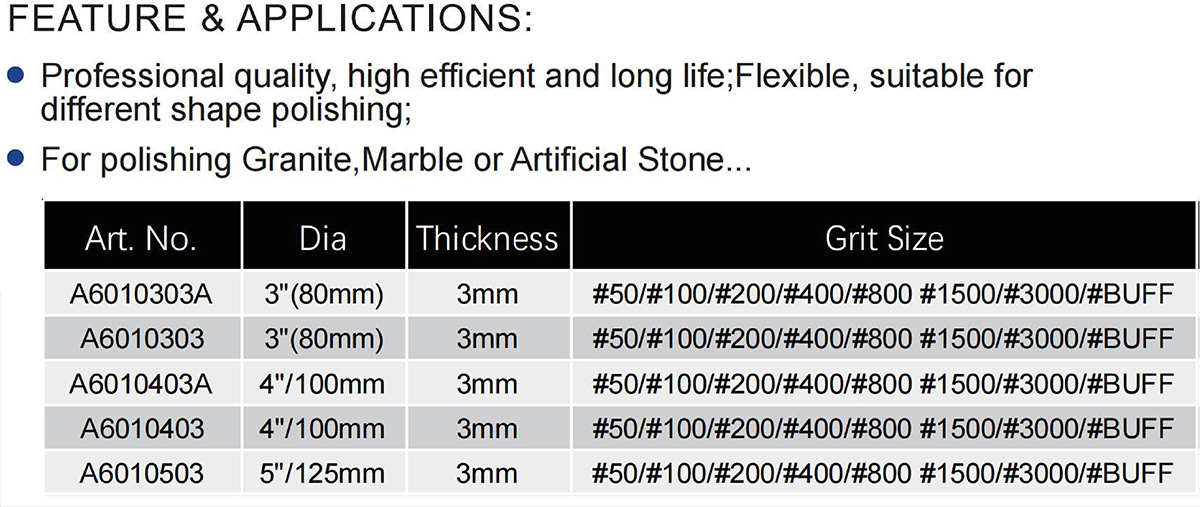 Resin Bond Flexible Diamond Wet Polishing Pads for Stone (Straight-grained) offer professional-quality, high-efficiency, and long-lasting performance for wet polishing granite, marble, and artificial stone. Their flexible design allows them to conform to various shapes and contours for superior results. These pads are available in diameters of 3″ (80mm), 4″ (100mm), and 5″ (125mm), all with a consistent 3mm thickness. The comprehensive range of grit sizes, from coarse #50 to fine #3000 and a final BUFF option, provides a complete polishing solution for every step from shaping to finishing.