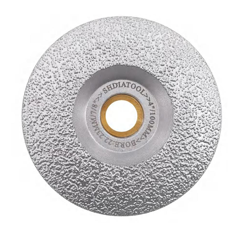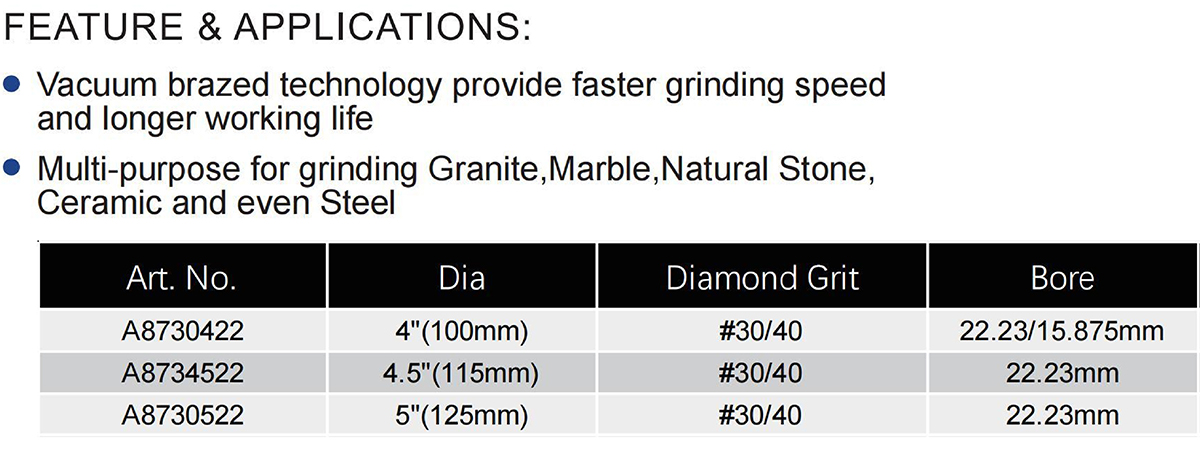Vacuum Brazed Diamond Grinding Wheel for General-Purpose (Convex) utilizes vacuum brazing technology to provide a faster grinding speed and a longer working life. Its convex shape makes it a multi-purpose tool suitable for grinding a wide range of materials including granite, marble, natural stone, ceramic, and even steel. It is available in several sizes: Art. No. A8730422 with a diameter of 4″ (100 mm), a diamond grit of #30/40, and a bore of 22.23/15.875 mm; Art. No. A8734522 with a diameter of 4.5″ (115 mm), a diamond grit of #30/40, and a bore of 22.23 mm; Art. No. A8730522 with a diameter of 5″ (125 mm), a diamond grit of #30/40, and a bore of 22.23 mm.