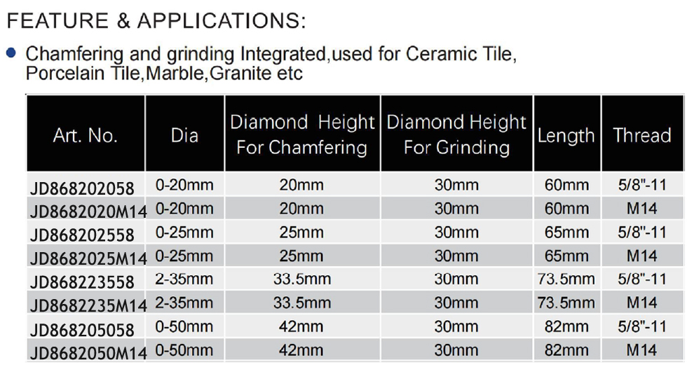 Vacuum Brazed Diamond Chamfer & Finger Bit integrates chamfering and grinding functions into one tool for precise edge shaping and surface finishing on ceramic tile, porcelain tile, marble, and granite. It features vacuum brazing technology for strong diamond bonding and a segmented design for smooth, chip-free operation, suitable for both wet and dry use with angle grinders. Available in multiple sizes: diameter 20 mm (Art. No. A868202058/M14) with 20 mm chamfer height, 30 mm grinding height, and 60 mm overall length; diameter 25 mm (Art. No. A868202558/M14) with 25 mm chamfer height, 30 mm grinding height, and 65 mm overall length; diameter 35 mm (Art. No. A868203558/M14) with 33.5 mm chamfer height, 30 mm grinding height, and 73.5 mm overall length; diameter 50 mm (Art. No. A868205058/M14) with 42 mm chamfer height, 30 mm grinding height, and 82 mm overall length. All models have a consistent grinding height of 30 mm and thread options of 5/8″-11 or M14.