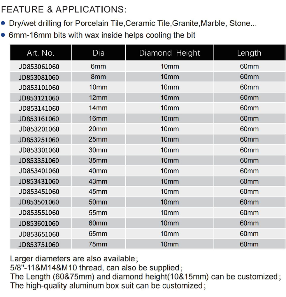 Vacuum Brazed Diamond Drill Bit for Ceramic/Porcelain/Stone is a high-performance tool designed for dry or wet drilling through hard materials including porcelain tile, ceramic tile, granite, marble, and stone. Utilizing vacuum brazing technology, it ensures aggressive and fast drilling with a long service life. The bits from 6mm to 16mm contain a special wax core that helps cool the bit during operation. It is compatible with standard angle grinders and is available in a comprehensive range of diameters: 6mm, 8mm, 10mm, 12mm, 14mm, 16mm, 20mm, 25mm, 30mm, 35mm, 40mm, 43mm, 45mm, 50mm, 55mm, 60mm, 65mm, and 75mm, all featuring a consistent diamond height of 10mm and an overall length of 60mm. Common thread types like 5/8″-11, M14, and M10 are available, and customization for length (60mm/75mm), diamond height (10mm/15mm), and larger diameters is supported.