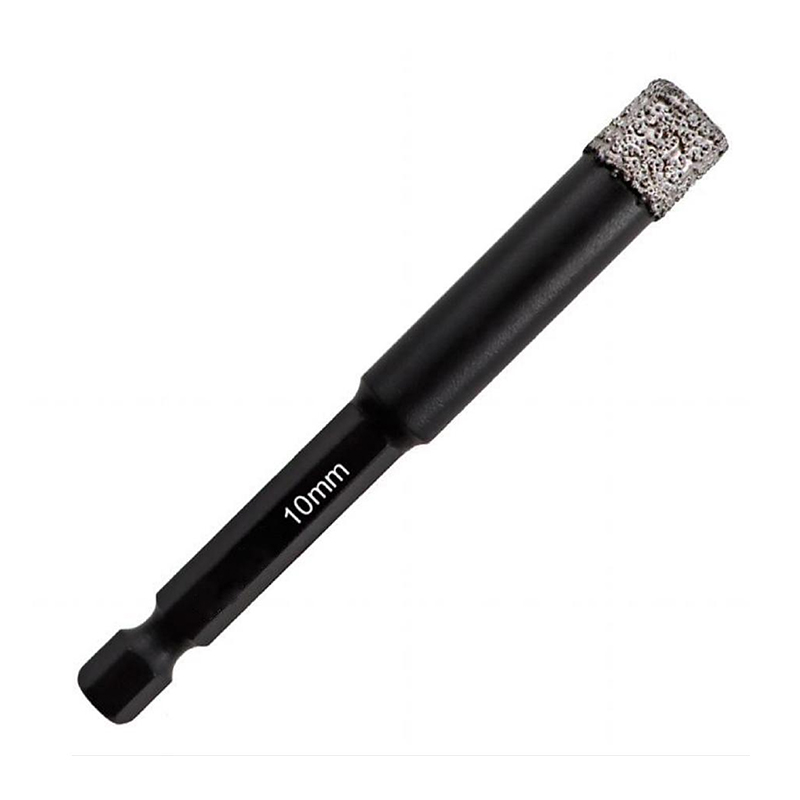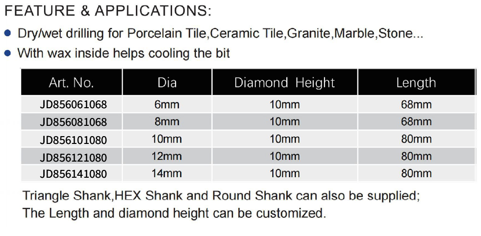 Vacuum Brazed Diamond Drill Bit with 1/4″ Quick Fit Shank is engineered for drilling into hard materials including porcelain tile, ceramic tile, granite, marble, and stone. Its vacuum brazing technology ensures a strong diamond bond for fast cutting and durability, while the convenient 1/4″ quick-fit shank allows for easy attachment to standard drills. A key feature is the wax-filled core that helps cool the bit during operation, supporting both dry and wet drilling applications. It is available in multiple precise sizes: Art. No. A8560610 with a 6mm diameter, 10mm diamond height, and 68mm length; Art. No. A8560810 with an 8mm diameter, 10mm diamond height, and 68mm length; Art. No. A8561010 with a 10mm diameter, 10mm diamond height, and 80mm length; Art. No. A8561210 with a 12mm diameter, 10mm diamond height, and 80mm length; and Art. No. A8561410 with a 14mm diameter, 10mm diamond height, and 80mm length. Custom options for triangle, HEX, and round shanks, as well as custom lengths and diamond heights, are also available upon request.