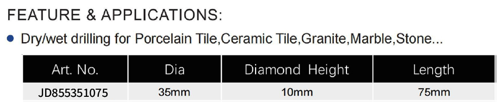 The Vacuum Brazed Diamond Drill Bit with an SDS-PLUS shank is engineered for efficient and durable drilling in hard materials including ceramic, porcelain tile, granite, marble, and natural stone. Utilizing advanced hot-press technology, it is designed for both dry and wet drilling operations, which significantly reduces dust and vibration for a cleaner and smoother working experience. This drill bit, specifically Art. No. A8553510SDS, has a diameter of 35mm, a diamond height of 10mm, and a total length of 75mm, making it an ideal attachment for angle grinders equipped with an appropriate adapter for various drilling tasks.