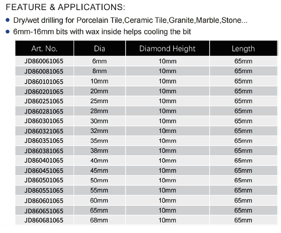 Vacuum Brazed Diamond Drill Bit with Triangle Shank is engineered for efficient dry or wet drilling in hard materials including ceramic, porcelain tile, granite, marble, and stone. Its key feature is the triangle shank that provides a secure, non-slip grip in standard drill chucks. For diameters ranging from 6mm to 16mm, the bits contain an internal wax filling that helps cool the bit during operation, enhancing durability. This versatile drill bit is available in a comprehensive size selection with a consistent diamond height of 10mm and a total length of 65mm for all sizes: 6mm (Art. No. A8600610), 8mm (A8600810), 10mm (A8601010), 20mm (A8602010), 25mm (A8602510), 28mm (A8602810), 30mm (A8603010), 32mm (A8603210), 35mm (A8603510), 38mm (A8603810), 40mm (A8604010), 45mm (A8604510), 50mm (A8605010), 55mm (A8605510), 60mm (A8606010), 65mm (A8606510), and 68mm (A8606810).