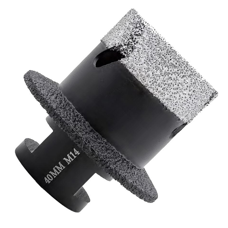The Vacuum Brazed Diamond Flume Drill Bit is specifically engineered for creating water tank holes and other stepped-hole applications in ceramic, porcelain, and stone. It adopts vacuum brazed processing technology for high efficiency and durability. Available in multiple sizes: Art. No. A8662406015 with a 40-60mm diameter, 15mm diamond height, 60mm length, and M14 5/8″-11 thread; Art. No. A8662456015 with a 45-60mm diameter; Art. No. A8662456515 with a 45-65mm diameter; and Art. No. A8662507015 with a 50-70mm diameter, all with a 15mm diamond height, 60mm length, and M14 5/8″-11 thread.